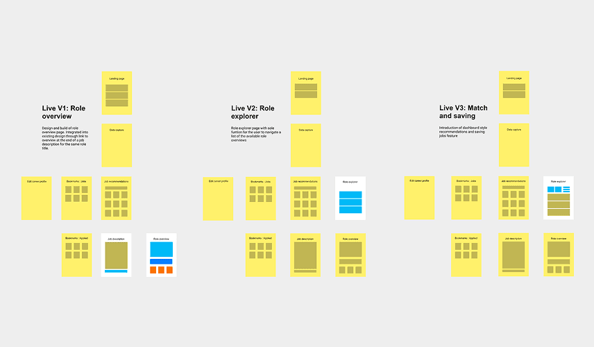 Phase 1: profiles via matching job descriptions. Phase 2: Role Explorer for standalone navigation. Phase 3: Personalisation and role matching (paused due to data maturity). I documented this as a template. The MVP release sitemap, became a company playbook entry.