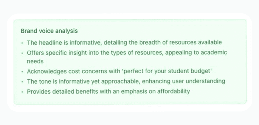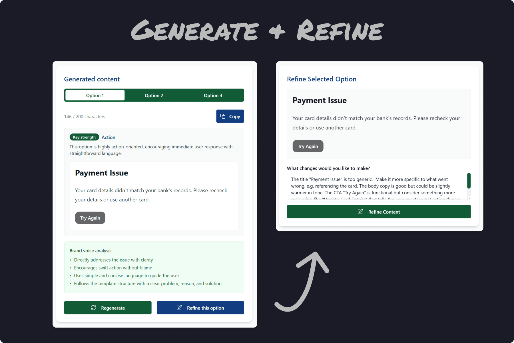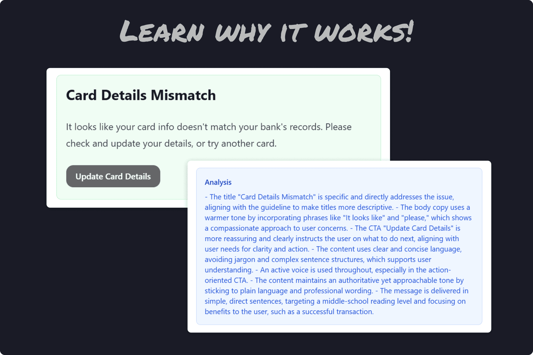 Every output includes a clear explanation of why it works, which UX writing principles it applied and what user need it prioritises. The tool teaches as it serves, building the team's writing instincts over time.