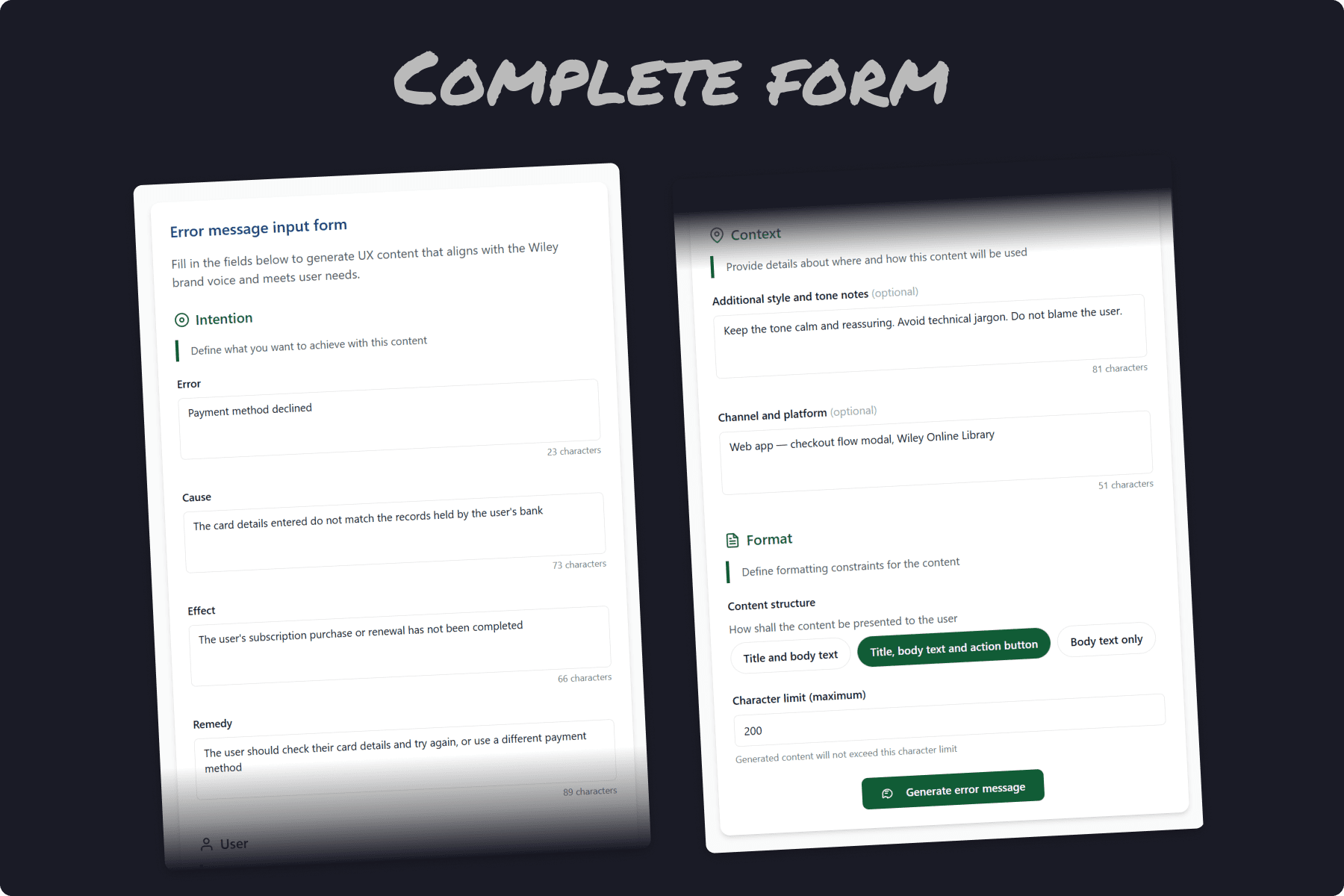 I crafted the form inputs based on my microcopy canvas tool, giving the model enough context to generate useful copy.