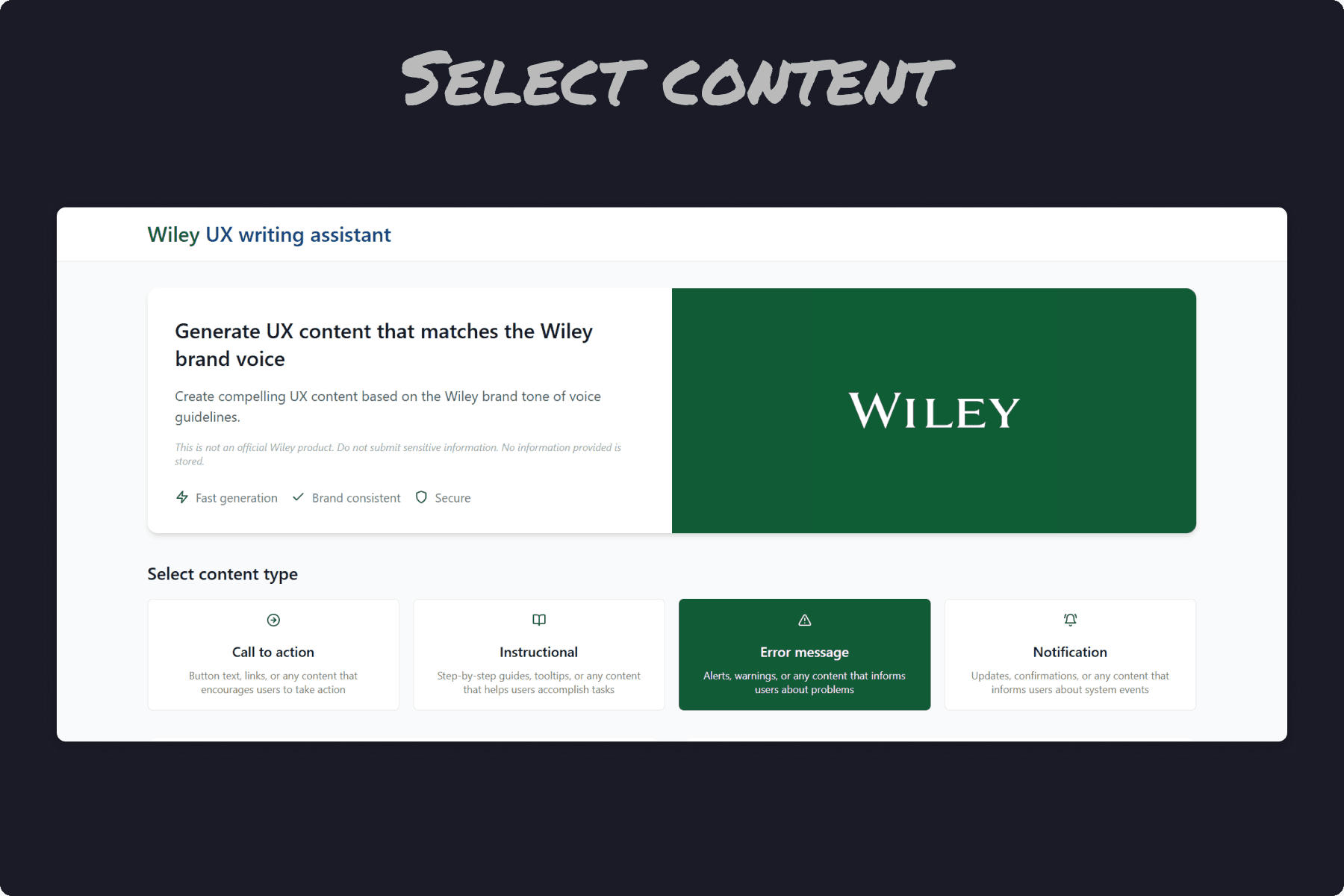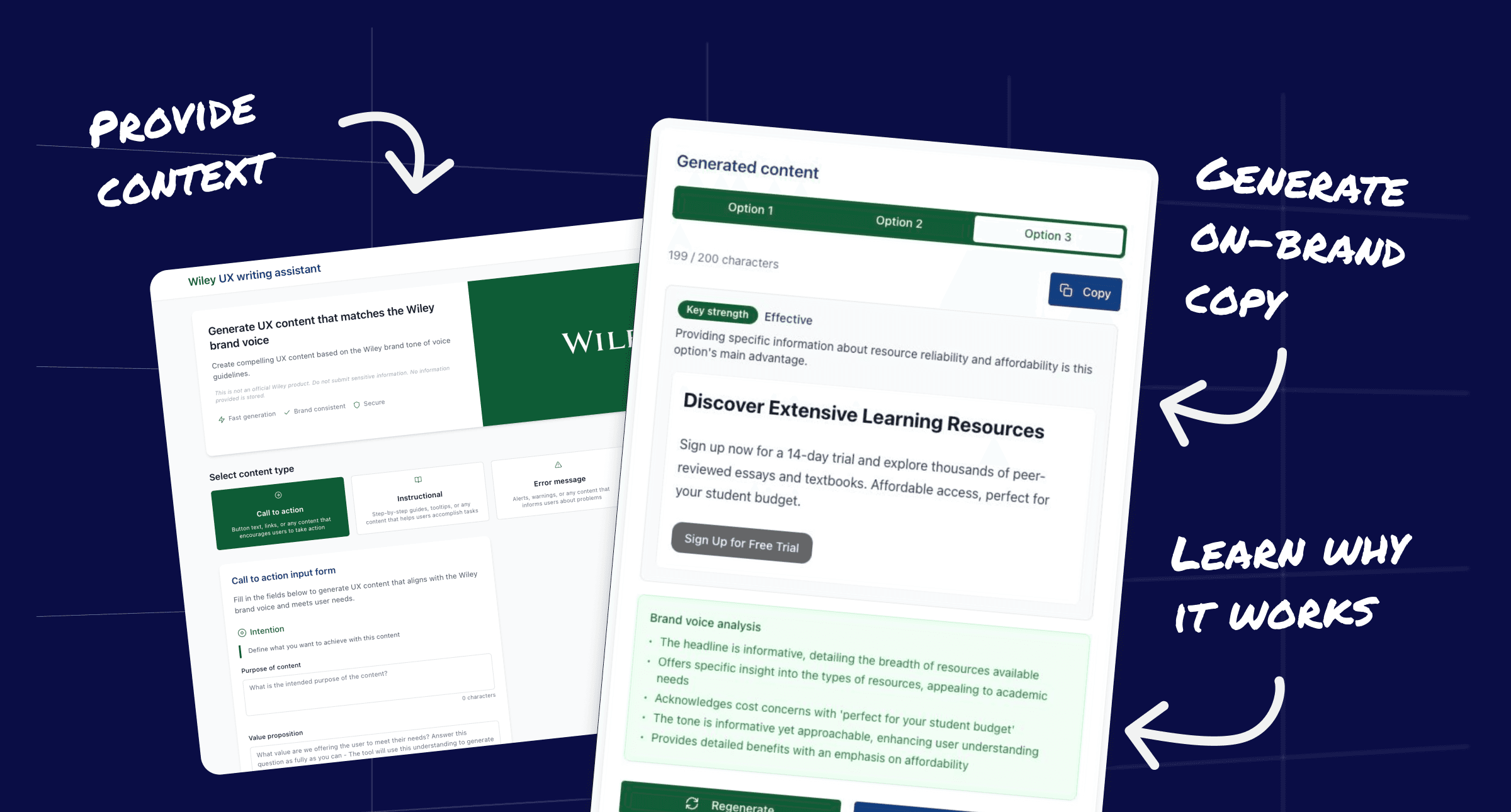An AI-powered web app that packages my writing process, Wiley's brand voice, and UX writing best practices into a self-serve tool.