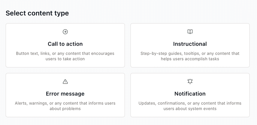 CTAs, error messages, instructional content, email subject lines - each with tailored form inputs and generation parameters. The tool adapts its reasoning to the context, not just the words.